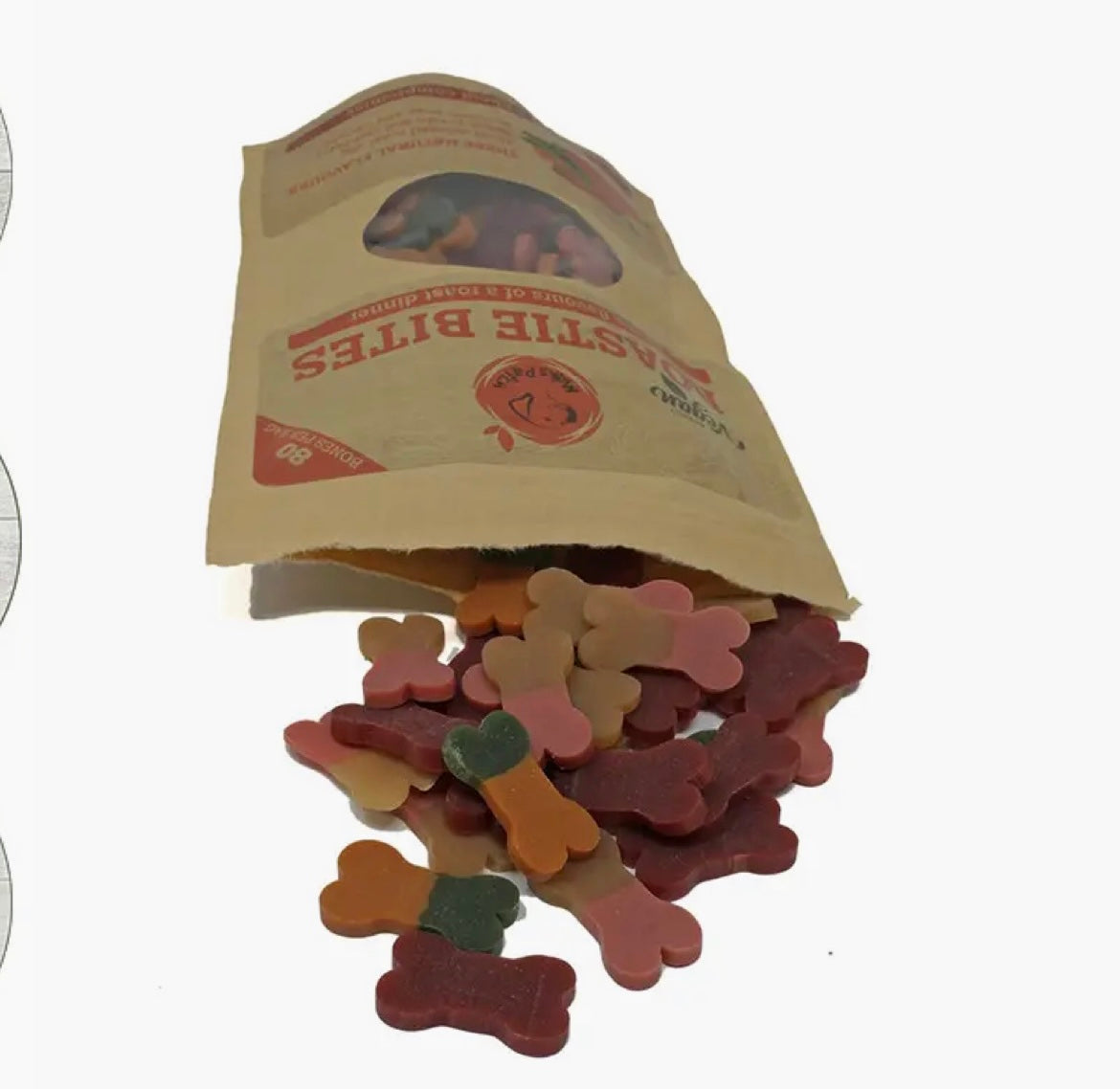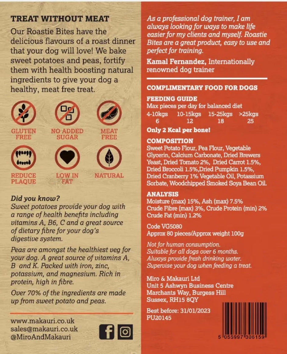 Our Roastie Bites have the delicious flavours of a roast dinner that your dog will love! baked sweet potatoes and peas, fortify them with health boosting natural ingredients to give your dog a healthy, meat free treat.