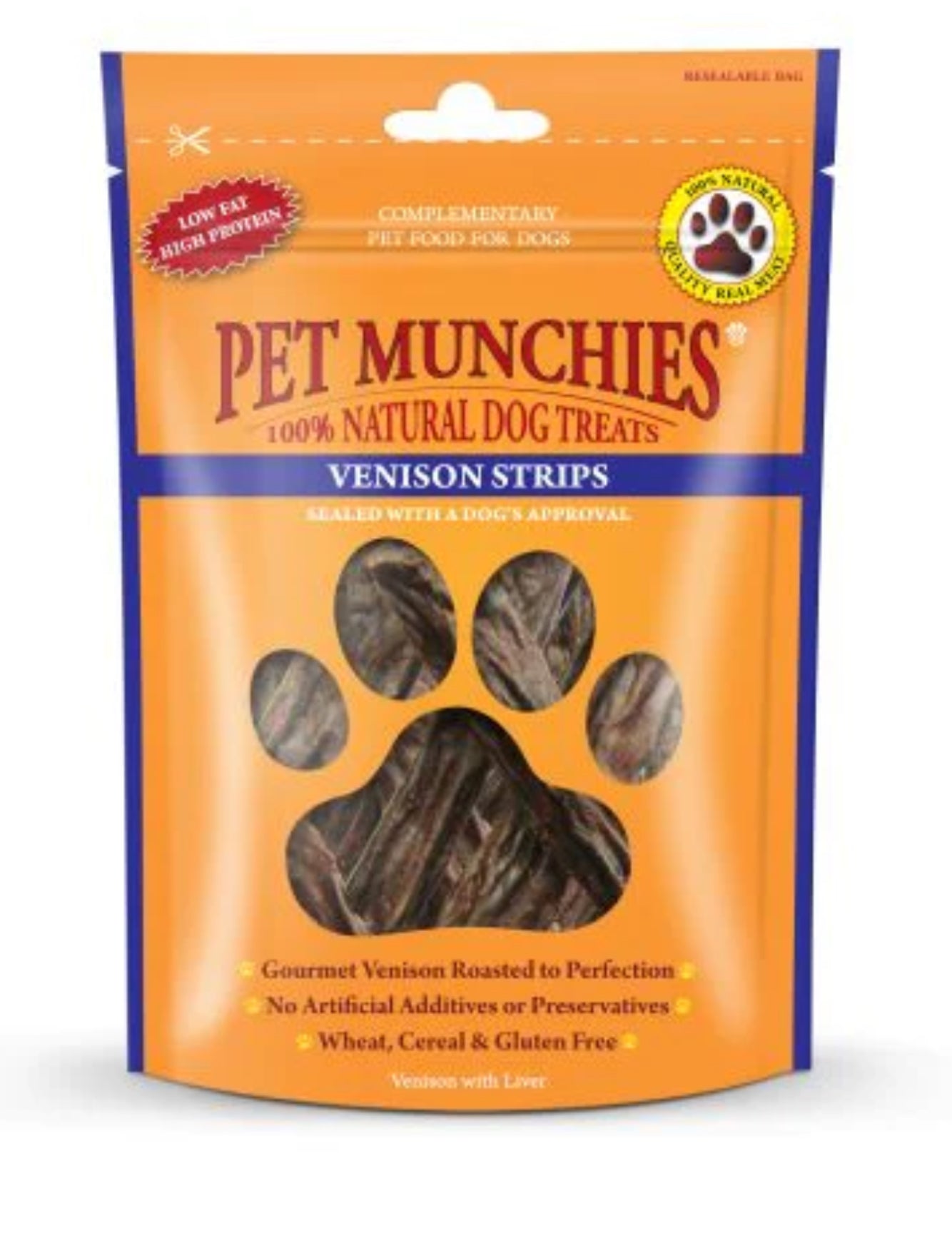 Pet Munchies succulent strips of venison can be given as a chew, and are easy to break up for training and rewards. Naturally low in fat, delicately roasted to perfection in their own natural juices. No artificial additives, preservatives, flavour or colours. Wheat, cereal and gluten free.